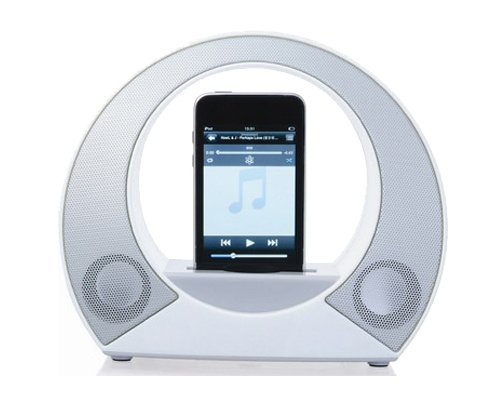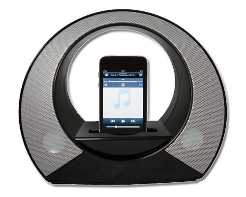 My sister bought me these speakers for my birthday but I returned it the same day. The picture shows an ipod touch playing on it but it wont fit an ipod like the picture. There is a jack on the bottom for ipods or any other device but this is still inconvenient. On top of that the product did not come with a D/C adapter so unless you already have one or are willing to buy one you are stuck using batteries and the radio works decent you just have to scan for a station you like which is time consuming. I was not overly impressed with the product but it does sound decent(just a slight amount of crackling when playing) as long as it is not on full blast or it will sound pretty bad.